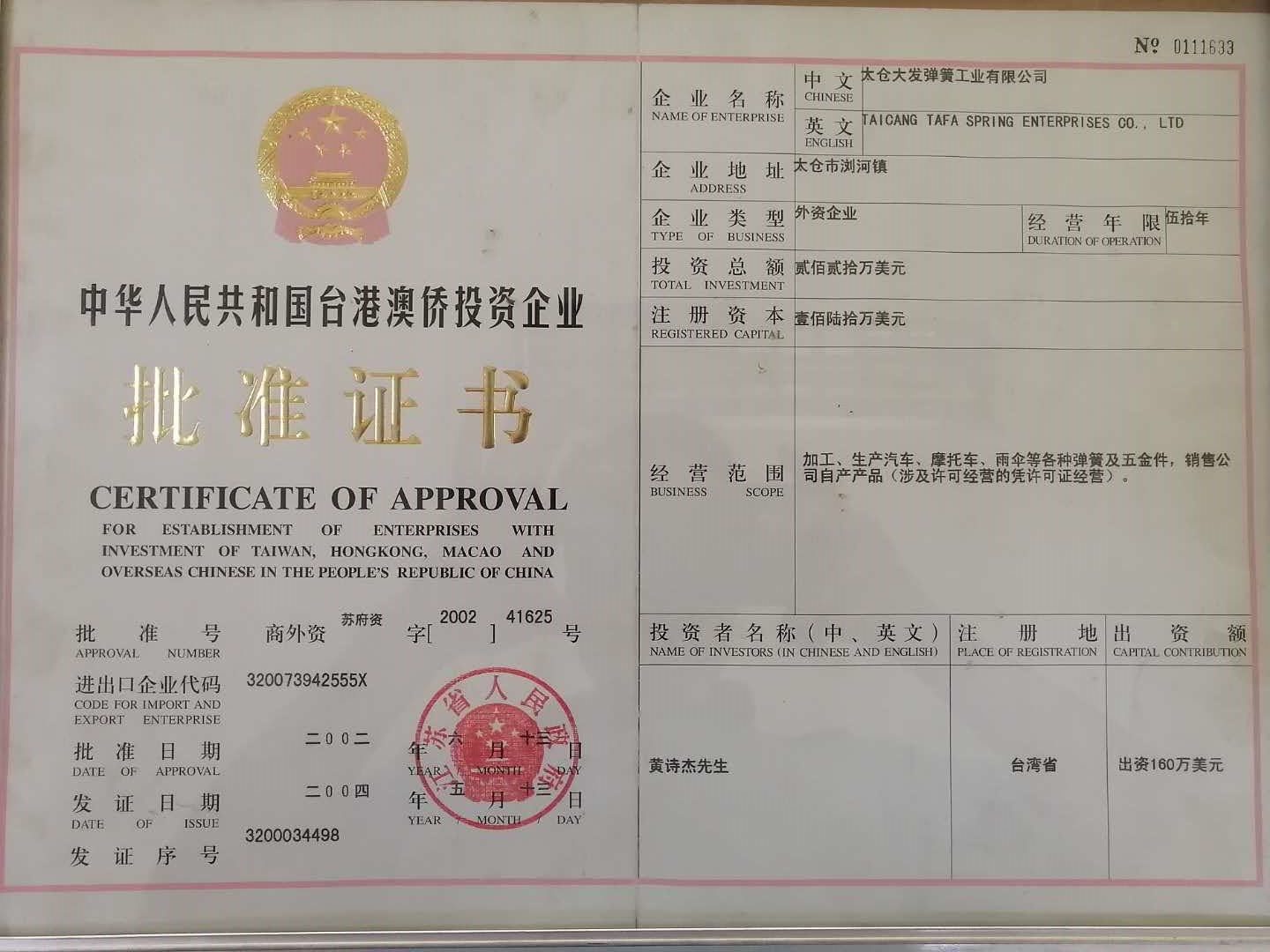 太倉大發(fā)彈簧工業(yè)有限公司由黃金樹先生于1967年始創(chuàng)于臺灣,是一個集雨傘、電子、五金機械、自行車、摩托車、汽車等的彈簧配件生產、加工、輔助設計服務的綜合性企業(yè),其中1990年創(chuàng)辦的廈門大發(fā)彈簧公司、2000年創(chuàng)辦的深圳大發(fā)彈簧公司、2002年創(chuàng)辦的太倉大發(fā)彈簧公司均位于經濟發(fā)展地區(qū),地理位置佳。我們憑借在彈簧制造業(yè)的多年豐富知識與技術,并著眼于以客戶為導向,秉持“以人為本,以質為先,以客為主,持續(xù)創(chuàng)新”的經營理念,強化競爭優(yōu)勢。公司導入ISO9001: 2000質量管理體系,執(zhí)行ISO14000:2000管理方式,倡導安全、高質量、高素質的生產。